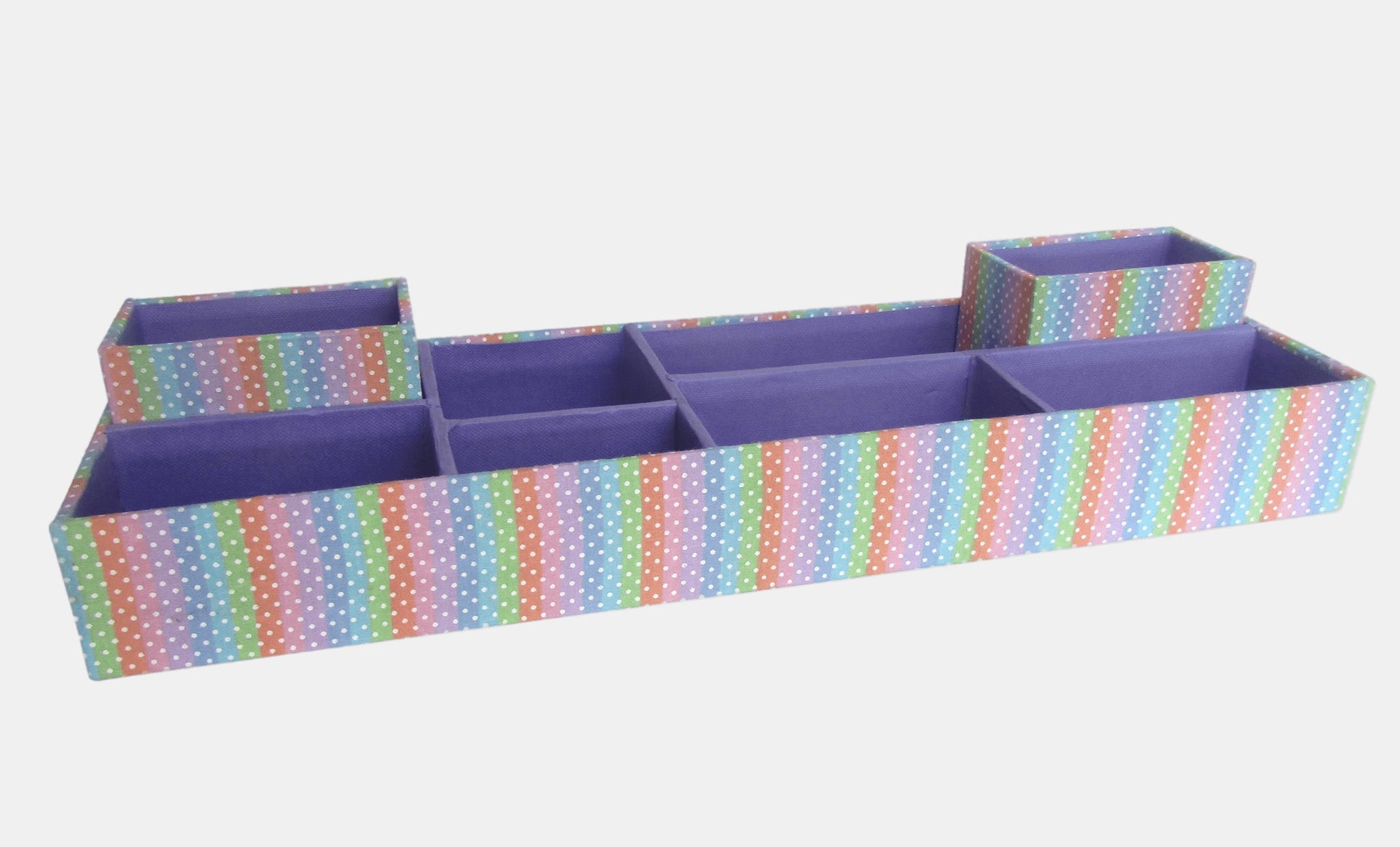 Este organizador está hecho de cartón resistente y viene cuidadosamente forrado en tela o papel impreso, brindando una apariencia elegante y atractiva. Con sus 7 divisiones de diferentes tamaños, podrás organizar tus bolígrafos, lápices, clips, notas adhesivas y otros elementos esenciales de manera práctica y eficiente.