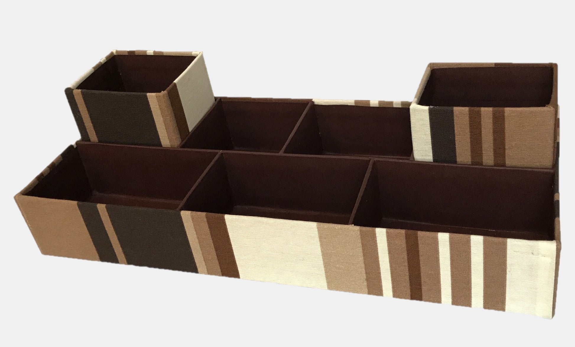 - Organizador de cartón forrado en tela o papel impreso, ofreciendo durabilidad y estilo.